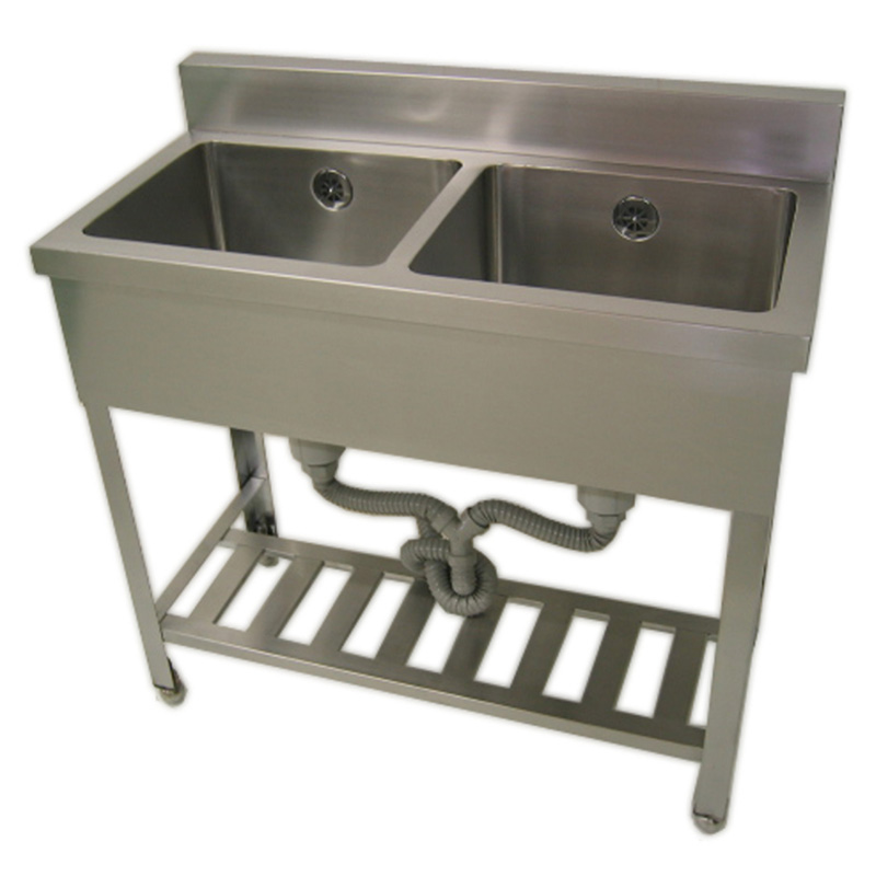 Stainless steel two-compartment sink with back guard. Available in 11 sizes.