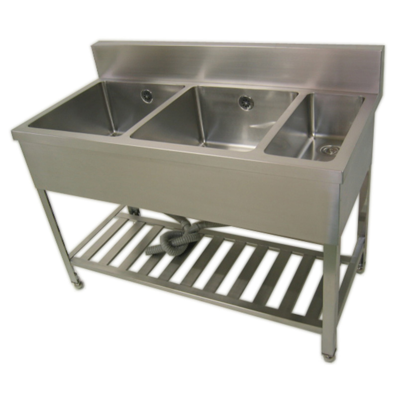 Stainless steel two-compartment sink with waste container. Available in 4 sizes. Waste basket sold separately: 11