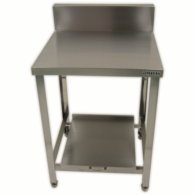 Commercial rice cooker stand with backsplash. Model with backsplash ideal for wall placement. Made of SUS430 stainless steel, suitable for rice cooker installation in restaurants and facilities. Equipped with casters for easy mobility.