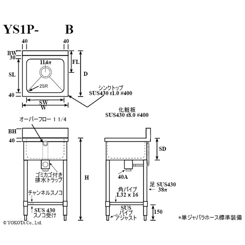 Commercial single-bowl sink with pipe legs. Ideal for wall-side installation with a backguard. The pipe leg design enhances stability. Made of SUS430 stainless steel, it offers excellent durability and is suitable for use in restaurants and facilities. Available in a wide range of sizes, allowing you to choose according to your installation space.