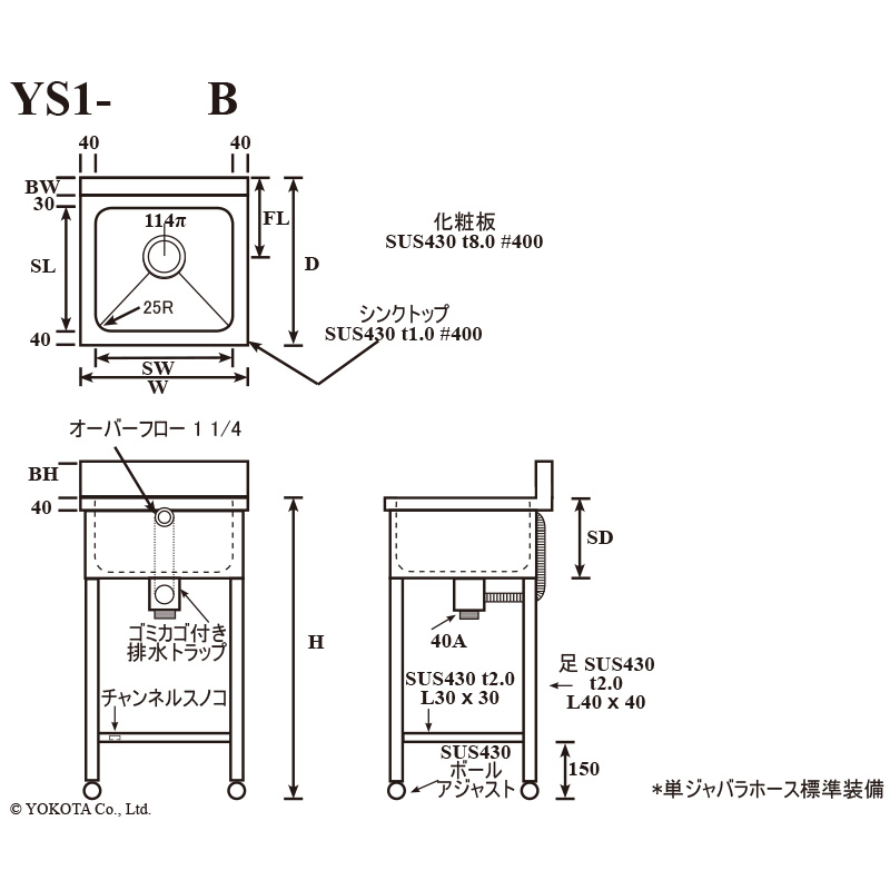 Commercial single-bowl sink. Ideal for wall installation with backsplash. Made of SUS430 stainless steel for excellent durability, suitable for use in restaurants and facilities. Available in a wide range of sizes to fit your installation space.