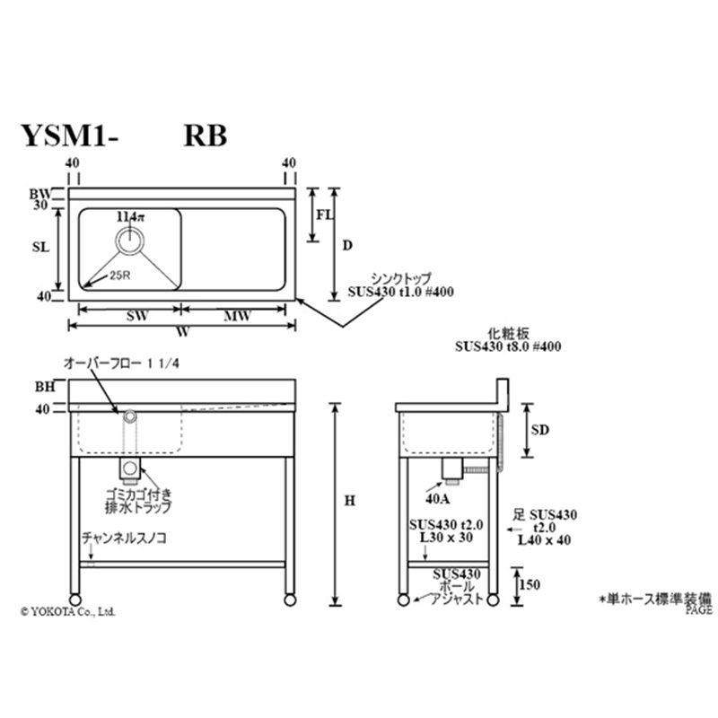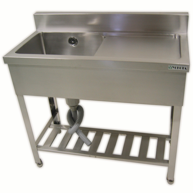 Commercial single-bowl sink with backsplash and drainboard. Features a drainboard for smooth drainage after washing. Available in two types: right drainboard (RB) and left drainboard (LB) to suit installation location. Equipped with backsplash for optimal wall-mounted installation. Angle leg type provides excellent stability. Made from SUS430 stainless steel, suitable for cooking and washing operations in restaurants and facilities.
