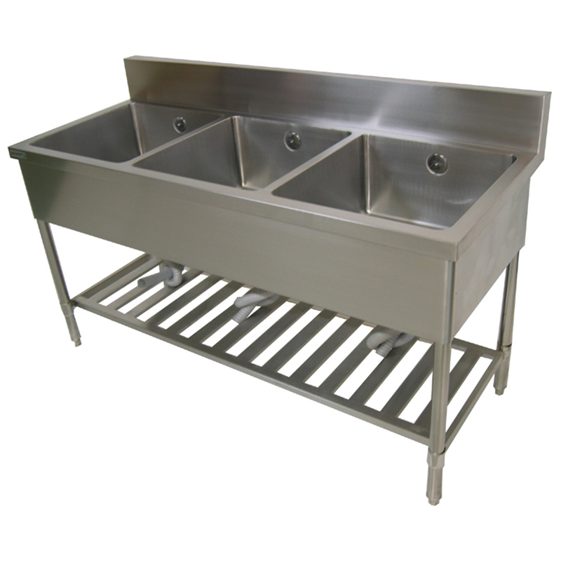Stainless steel three-compartment sink with backsplash. Available in 7 sizes.