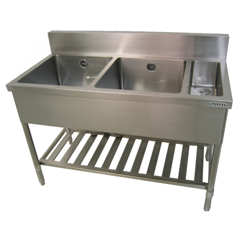 Stainless steel two-compartment sink with waste container. Available in 4 sizes. Waste basket sold separately: 11
