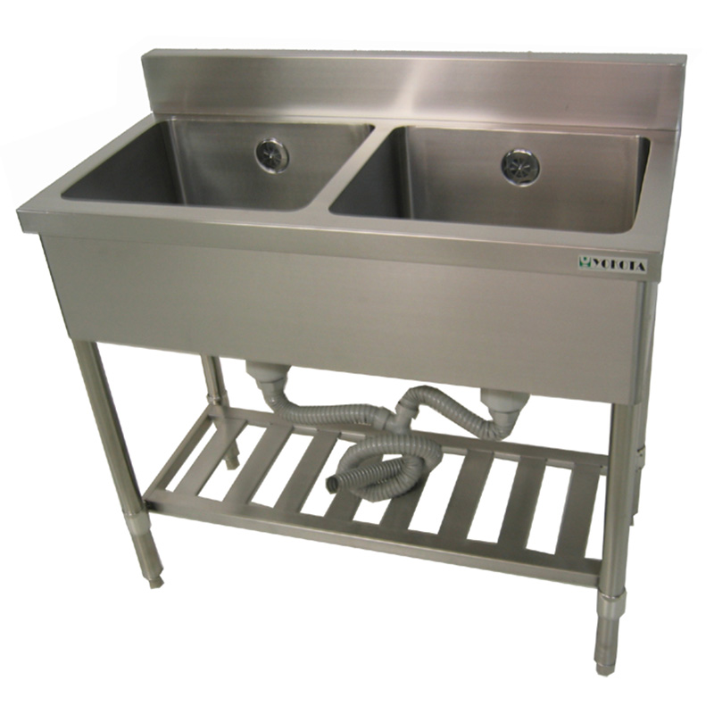 Stainless steel two-compartment sink with back guard. Available in 11 sizes.