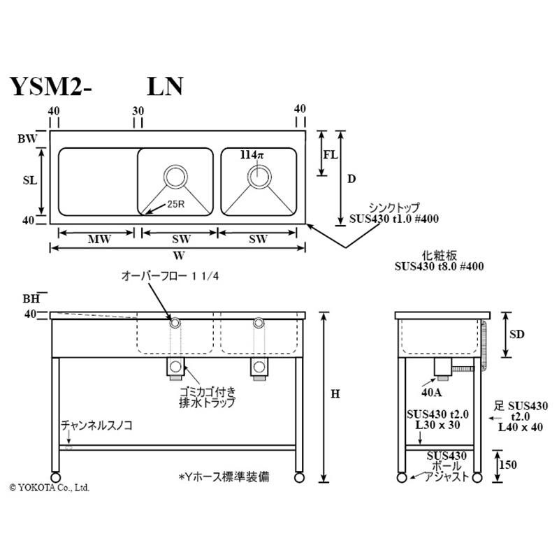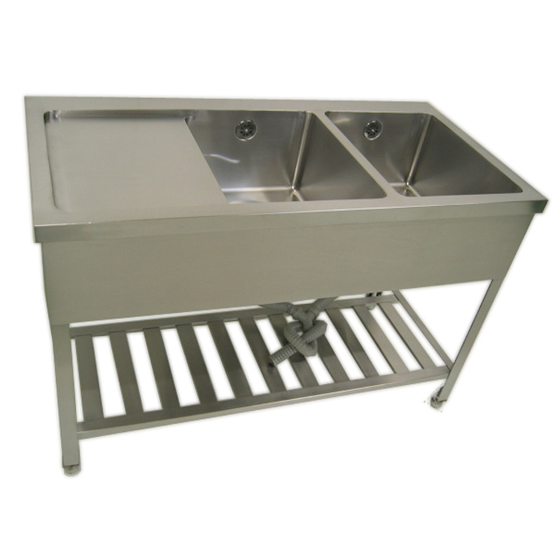 Stainless steel two-compartment sink with drainboard. Available in 14 sizes.