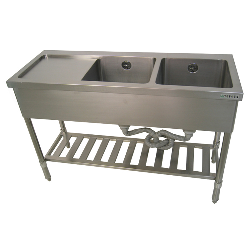Stainless steel two-compartment sink with drainboard. Available in 14 sizes.
