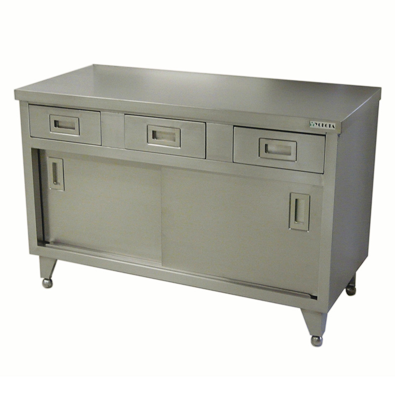 Stainless steel work table. Equipped with drawers and sliding doors. Available in 10 sizes.